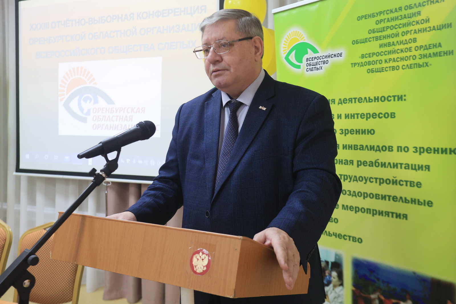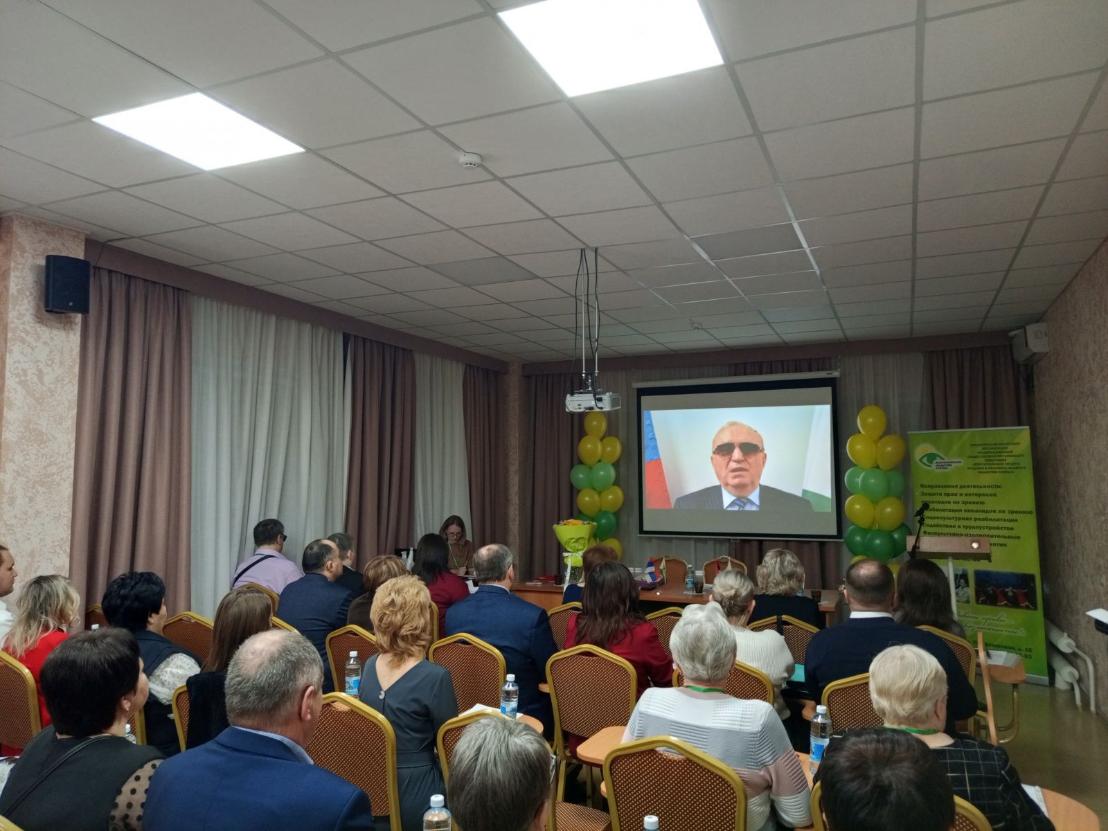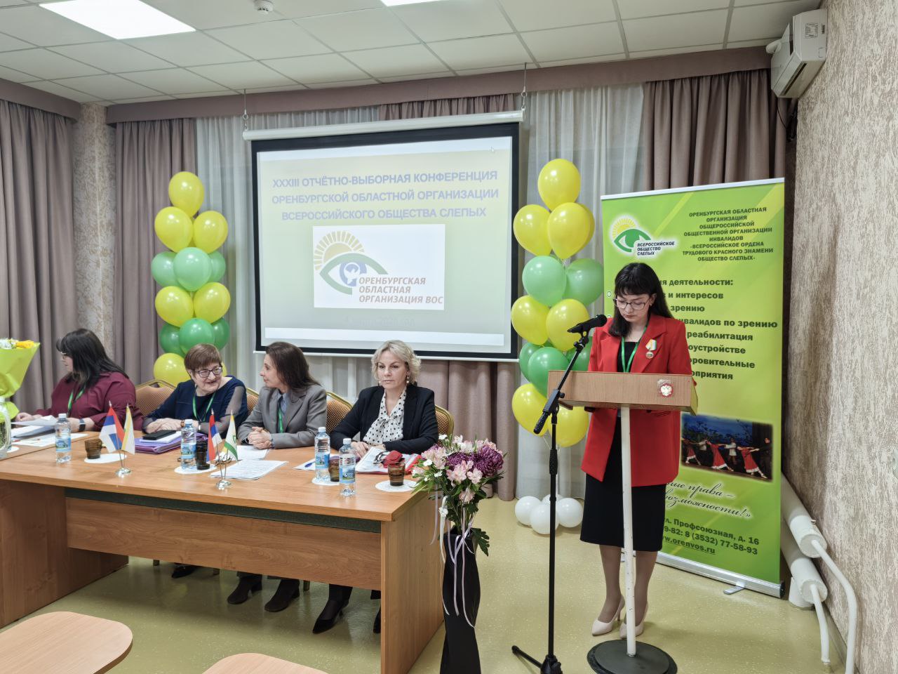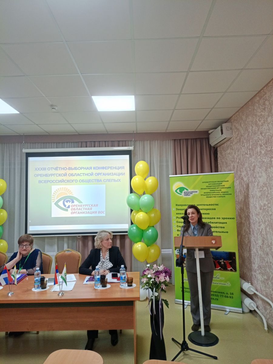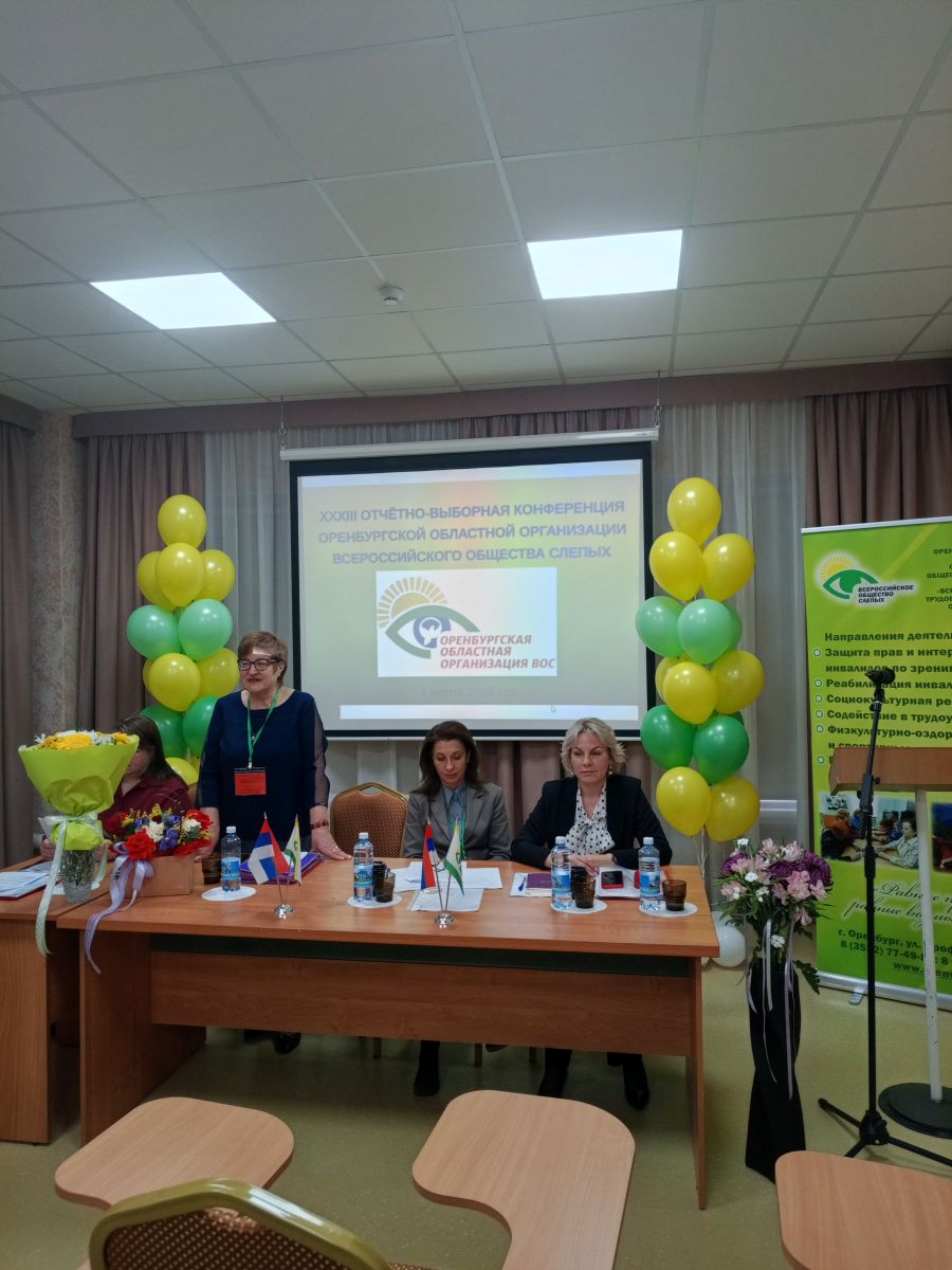 Отчетно-выборная конференция – это не только серьезное мероприятие, но и праздник для каждого его участника. Создать атмосферу праздника помогли, как казалось на первый взгляд, маленькие штрихи, которые собрав воедино давали яркую картину торжества: позитивное и радостное настроение организаторов; музыка, которая встречала участников Конференции при входе в зал; большой экран с яркой желто-зеленой эмблемой Оренбургской ОО ВОС, «ролл ап», на котором указаны основные виды деятельности общества, фонтаны из воздушных шаров в соответствующей цветовой гамме; стол президиума, украшенный живыми цветами и флагами РФ и ВОС, все это создавало хорошее настроение.