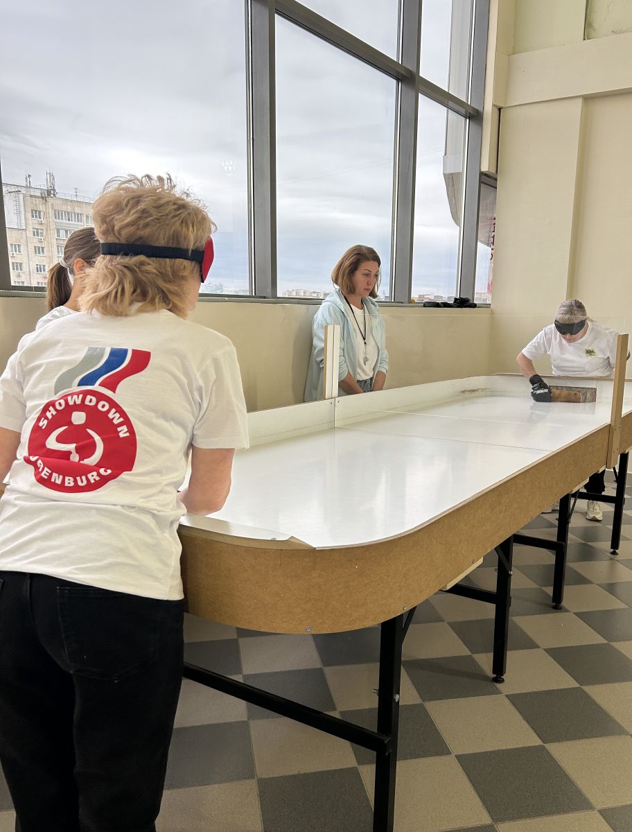 Относительно новая дисциплина в адаптивном спорте — «настольный теннис для слепых», или (на иностранный манер) "шоудаун". В России эта игра, активно культивируется последние десять лет и обретает все большую популярность не только среди тех, у кого есть проблемы со зрением. В Оренбургской областной организации ВОС также стало доброй традицией ежегодное проведение в рамках месячника «Белой трости» соревнований по настольному теннису для слепых. В этом году соревнования прошли 28 октября в СКК «Оренбуржье». Участниками стали 8 спортсменов среди которых были как полностью незрячие, так и с остаточным зрением. Однако это обстоятельство нисколько не влияло на шансы победить, ведь, как известно, одним из элементов экипировки в данной игре является светонепроницаемая маска, благодаря которой все игроки оказываются в равных условиях.